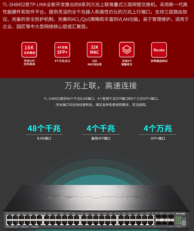 以太網(wǎng)交換機(jī)普聯(lián)/TP-LINK萬兆上層堆疊式交換機(jī)網(wǎng)管堆疊式三層網(wǎng)管TL-SH8452/臺